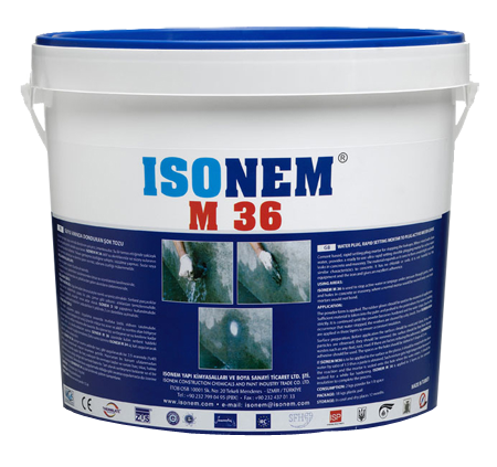 Isonem M36, basınçlı su sızıntılarının durdurulmasında, çatlaklardan gelen akıntıların kesilmesinde, çimento esaslı yalıtım uygulamaları öncesinde yüzeyin kurutulmasında etkili bir çözümdür. Su ile reaksiyona girerek hızla priz alır ve yüzeyde suya dayanıklı bir tabaka oluşturur. Uygulama kuru toz veya suyla karıştırılmış macun kıvamında yapılabilir. Kısa reaksiyon süresi sayesinde yapı içi su akıntılarını anında keser.